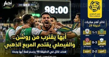 اختتمت مساء اليوم الأربعاء 15 أبريل 2026 (الموافق 27 شوال 1447 هـ) منافسات الجولة التاسعة والعشرين من دوري يلو لأندية الدرجة الأولى السعودي، وشهدت مباريات اليوم إثارة بالغة وتغييرات جوهرية في خارطة ترتيب المسابقة، حيث اقترب نادي أبها من حسم صعوده رسمياً، بينما اشتعل الصراع على مراكز المقدمة بعد فوز عريض للفيصلي.