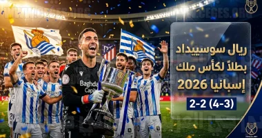 نجح فريق ريال سوسييداد في كتابة التاريخ مجدداً بالتتويج بلقب كأس ملك إسبانيا لكرة القدم لعام 2026، عقب فوزه المثير على أتلتيكو مدريد بركلات الترجيح بنتيجة (4-3)، في المباراة النهائية التي أقيمت مساء أمس السبت 18 أبريل 2026 على أرضية ملعب “لا كارتوخا” بمدينة إشبيلية، وانتهى الوقتان الأصلي والإضافي بالتعادل الإيجابي بهدفين لكل فريق، في مواجهة وصفتها الصحافة الإسبانية بـ “مباراة الموسم”.