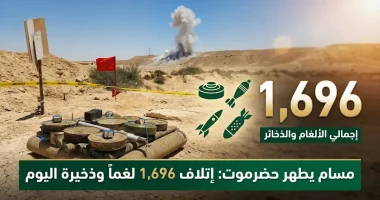 في إطار الجهود الإنسانية المستمرة للمملكة العربية السعودية لتأمين الأراضي اليمنية، نفذت فرق الطوارئ التابعة لمشروع “مسام” لنزع الألغام، بالتعاون مع المركز التنفيذي للتعامل مع الألغام في المكلا، عملية إتلاف واسعة النطاق اليوم الأربعاء 22 أبريل 2026، شملت 1,696 قطعة من الألغام والمخلفات الحربية في محافظة حضرموت.