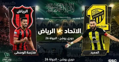 تتجه أنظار جماهير كرة القدم السعودية مساء اليوم الجمعة 13 مارس 2026 نحو استاد مدينة الأمير فيصل بن فهد الرياضية بالعاصمة الرياض، حيث تقام مواجهة مرتقبة تجمع بين فريق الاتحاد ونظيره الرياض، وذلك ضمن منافسات الجولة الـ26 من دوري روشن السعودي للمحترفين، والتي تتزامن مع احتفالات المملكة بـ “جولة يوم العلم” لعام 1447 هـ.