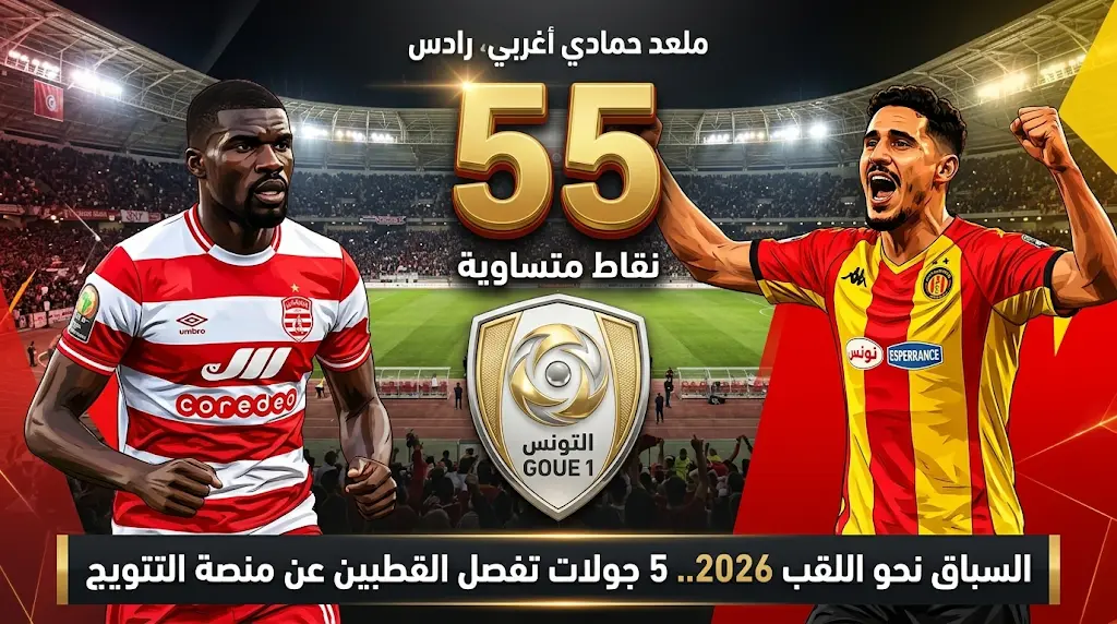 دخل سباق المنافسة على لقب الدوري التونسي لموسم 2025-2026 مرحلة “تكسير العظام” بين قطبي العاصمة، الترجي الرياضي والنادي الإفريقي، مع بقاء 5 محطات فقط على خط النهاية، ويقف الفريقان حالياً، اليوم الجمعة 24 أبريل 2026، على خط واحد في قمة جدول الترتيب برصيد 55 نقطة لكل منهما، بعد مسيرة متشابهة حقق فيها كل طرف 16 انتصاراً و7 تعادلات، مقابل تعثرهما في مباراتين فقط.