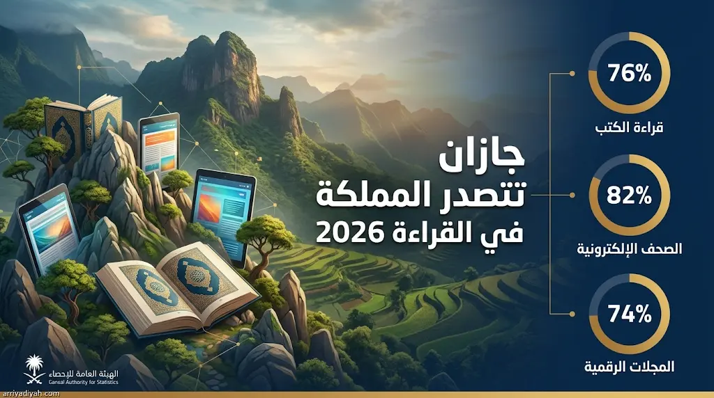 وفقاً لأحدث تقارير الهيئة العامة للإحصاء، تصدرت منطقة جازان المركز الأول كأكثر مناطق المملكة قراءةً بنسبة بلغت 76%.