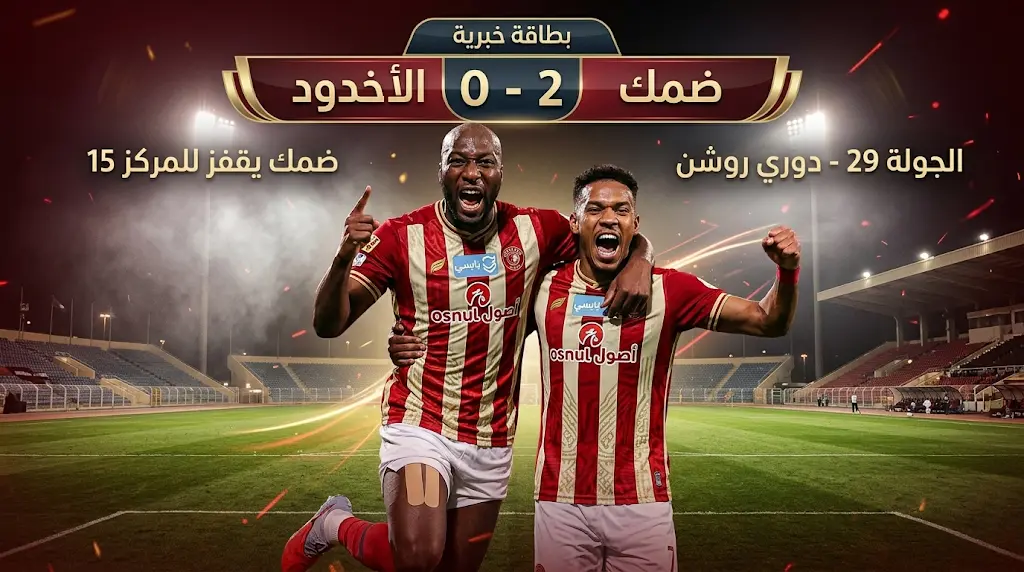 حقق الفريق الأول لكرة القدم بنادي ضمك انتصاراً ثميناً على حساب ضيفه نادي الأخدود بنتيجة (2-0)، في المباراة التي جمعت الفريقين مساء أمس الخميس 23 أبريل 2026، ضمن منافسات الجولة التاسعة والعشرين من دوري روشن السعودي للمحترفين (2025-2026)، هذا الفوز منح ضمك دفعة قوية في صراع تأمين البقاء، بينما تعقدت وضعية الأخدود في مراكز الهبوط.
